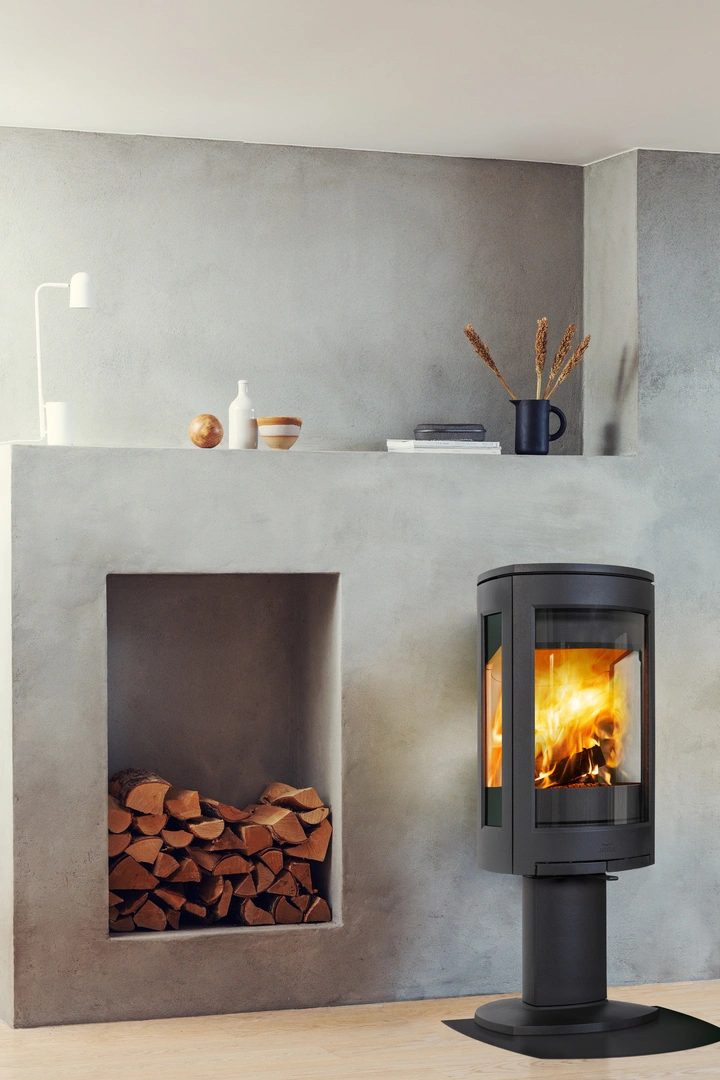 - Lekkość formy: Osadzenie pieca na eleganckiej kolumnie nadaje całej konstrukcji lekkości, co sprawia, że mimo swojej mocy, piec nie przytłacza nawet mniejszych pomieszczeń.